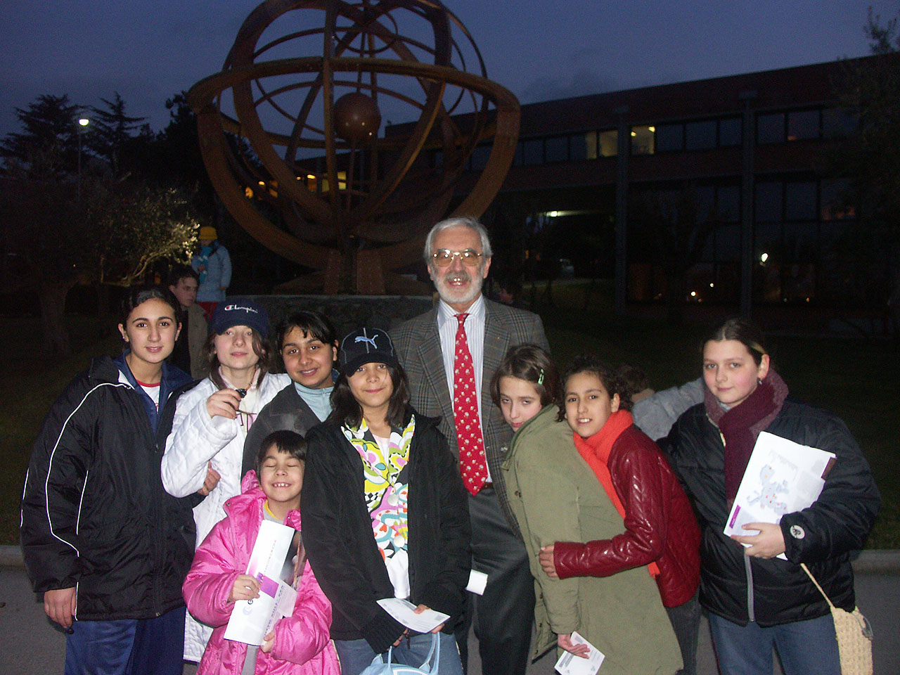 Usciti da questo mondo fantastico, arriviamo all'antenna di ricezione, dove, nel bel mezzo degli ulivi, si scherza un pochino e si fanno foto. Il Sole non sembra volerci lasciare al buio, e ci accompagna nell'ultima stazione della gita: la sfera armillaria. Altre foto: magicamente sono le 18:30. Pochi minuti e l'autobus arriva, proprio mentre il Sole scende a dormire.